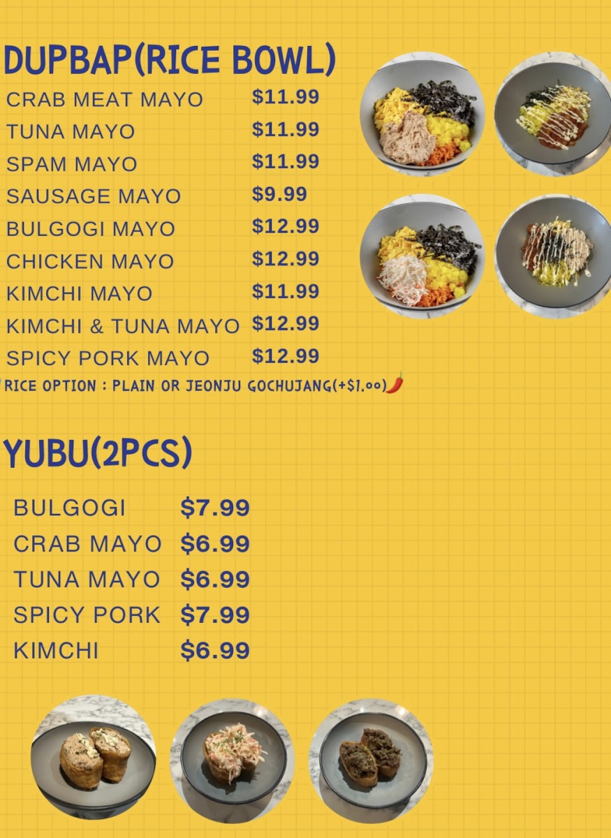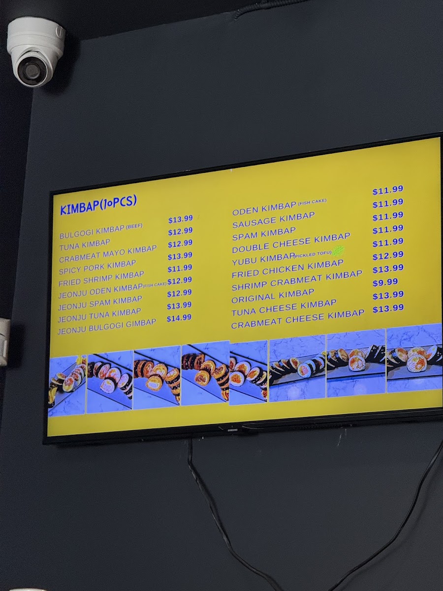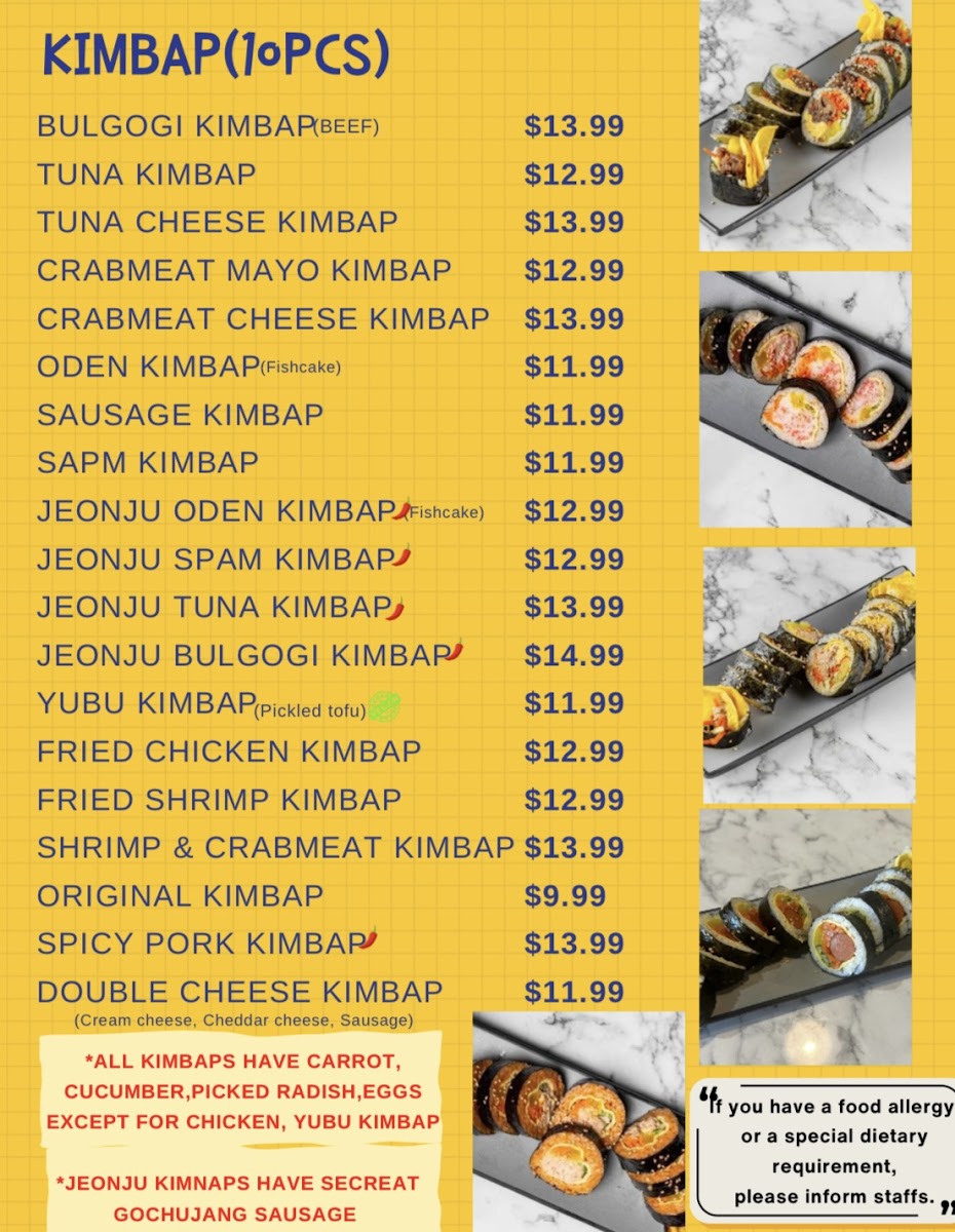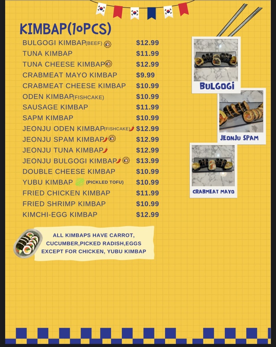 Kimbap: This category features several types of kimbap rolls, usually served in 10-piece portions. Options include classic varieties such as Original Kimbap and Tuna Kimbap, as well as more specialty selections like Jeonju Tuna Kimbap, Wasabi Bulgogi Kimbap, and Spam Kimbap. Some items are mildly spiced to cater to varied taste preferences.