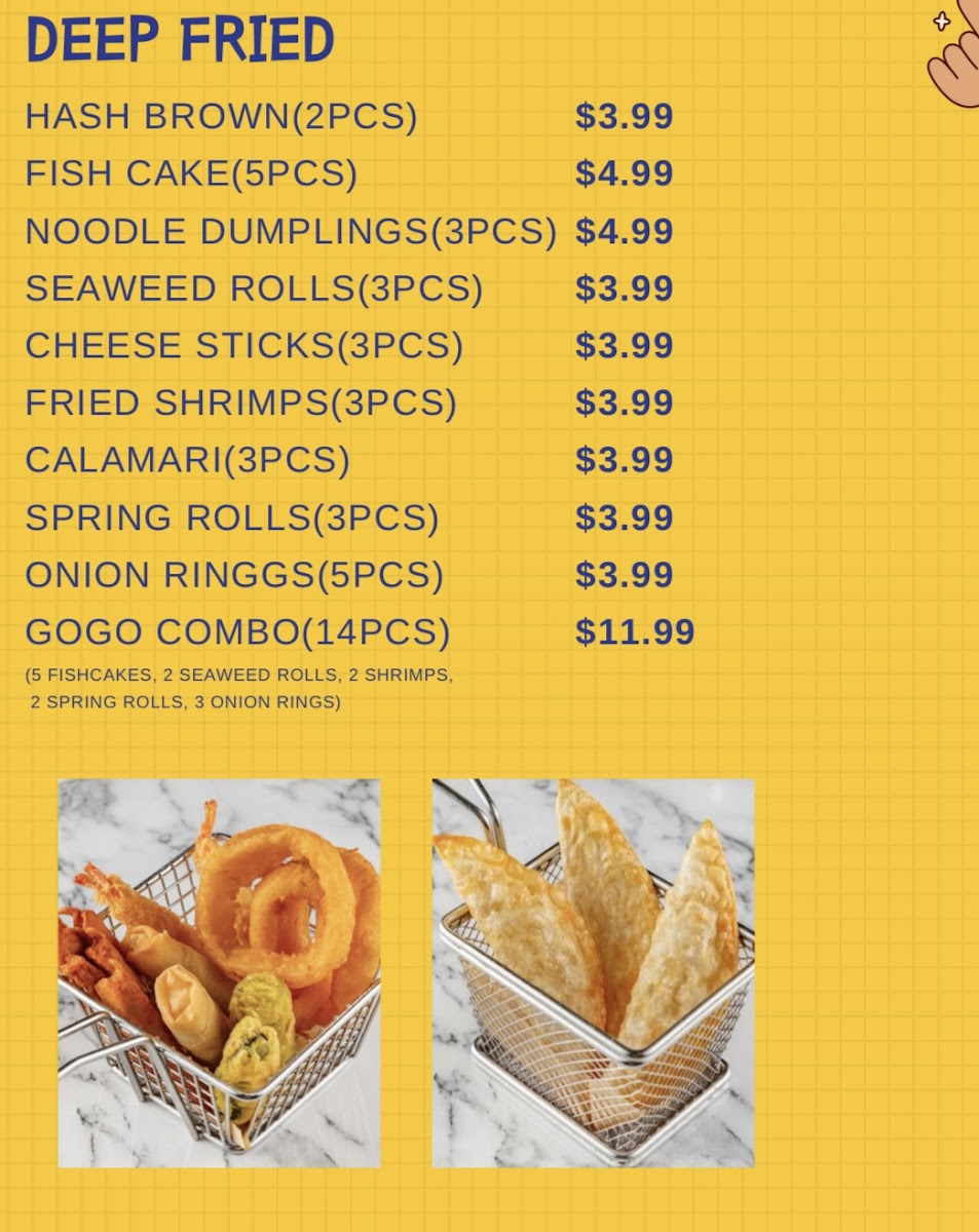 Deep-Fried Items: The menu includes a variety of fried snacks available in small portions, such as Onion Rings, Fried Shrimps, Cheese Sticks, Spring Rolls, and Fish Cakes. There is also a Gogo Combo featuring a selection of these fried items bundled together.