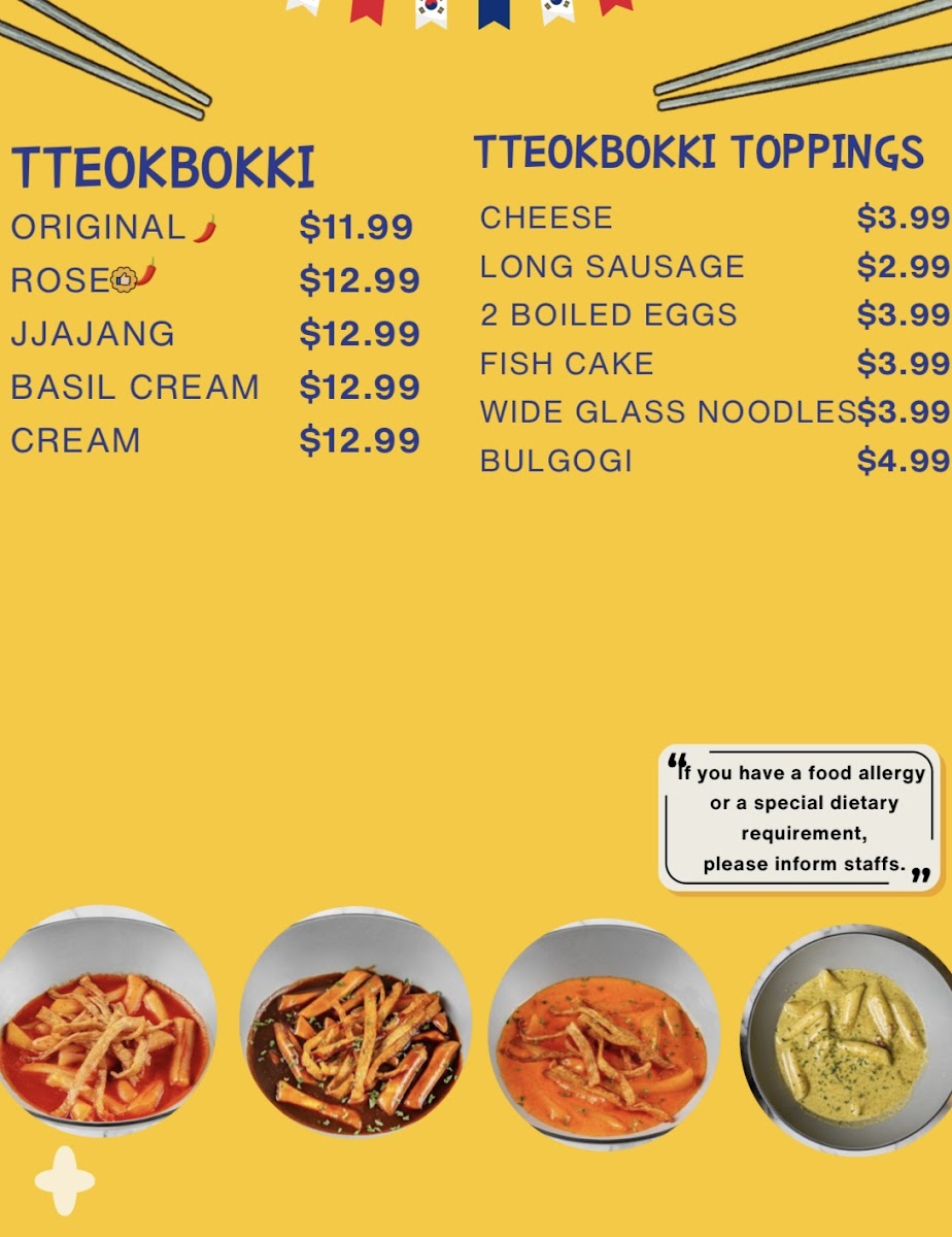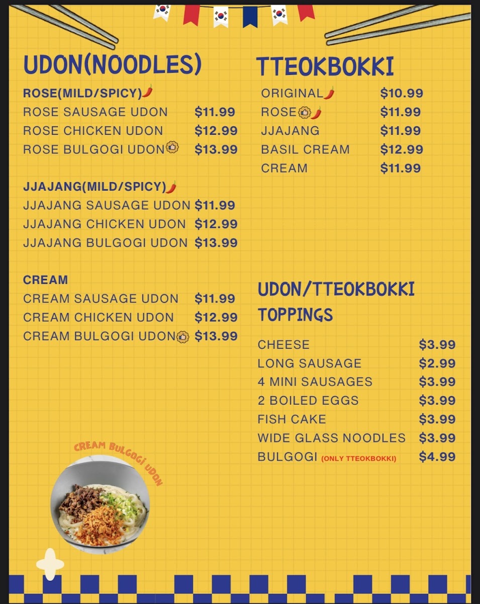Udon (Noodles): Udon dishes are offered with various toppings and flavor profiles, including Rose Chicken Udon, Rose Sausage Udon, and Rose Bulgogi Udon. These are mild in spice and designed as warm noodle meals.